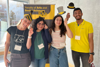 Welcome to the first month of the 2023 fall term in the Faculty of Arts and Social Sciences (FASS)! We encourage you to read through the first edition of the FASS monthly students e-newsletter for the 2023-24 academic year! We started the year by welcoming the new-to-Dal first-year FASS students at the Dal Welcome Fair and also at the FASS First-Year Student Mixer event! The FASS Dean, Dr. Jennifer Andrews, as well as other members of the Dean's Office team and instructors of the Introduction to Humanities and Introduction to Social Sciences classes were thrilled to see so many new students mixing and mingling at this event that we hosted on the first day of classes. We had a great time meeting many of the first-year FASS students. We ate pizza and had fun while taking some photos wearing our fancy FASS-cinators! Check out the photos of some of the students and faculty members who were in attendance.