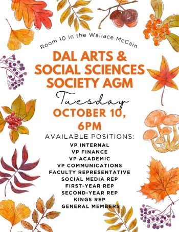 The Dalhousie Arts and Social Sciences Society (DASSS) will be hosting its Fall Annual General Meeting on Tuesday, October 10th from 6:00 pm – 8:00 pm in room 10 of the Wallace McCain Learning Commons. We will be sharing our plans for the new year and electing the new executive. Please follow the DASSS student society Instagram for event updates and a list of executive positions available.