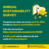 Dalhousie’s Office of Sustainability is running its annual Campus Sustainability and Transportation Survey and is seeking your input to make the University more sustainable. You will help the Office improve existing programs and implement new initiatives. The survey will take approximately 10 minutes to complete, and we are looking for responses from all students, faculty, and staff at Dalhousie University campuses.