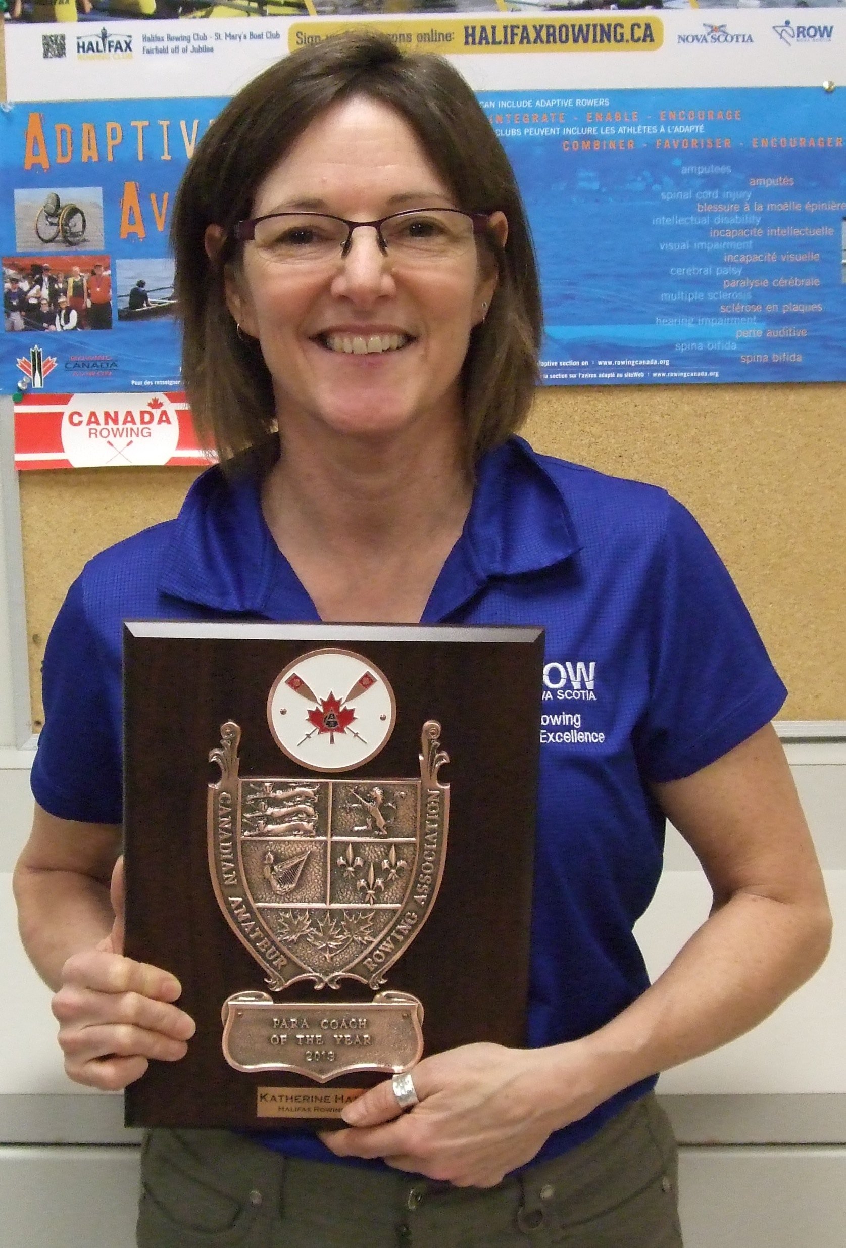 The School of Physiotherapy recognizes Dr. Katherine Harman, Associate Professor and Graduate Coordinator, on receiving the 2013 Para Coach of the Year at Rowing Canada Aviron's Annual General Meeting in London, Ontario on January 26, 2014.