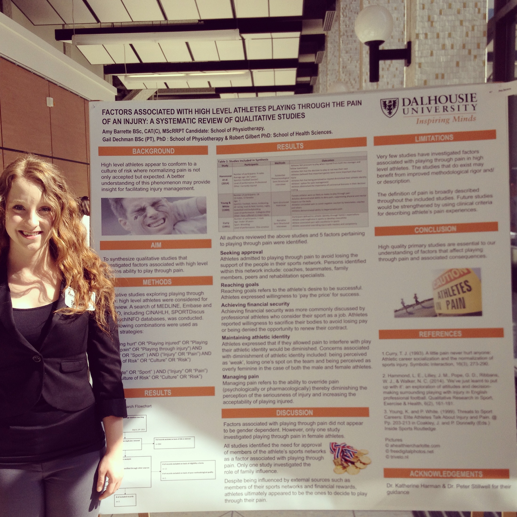 Barrette, A., Dechman, G. Factors associated with high level athletes playing through pain of an injury: a systematic review of qualitative studies. Dalousie Pain Research Day, Halifax, Nova Scotia, June, 2015 MSc Rehabilitation Reseach Student, Amy Barrette presents her poster at DAL Pain Research Day in June, 2015.