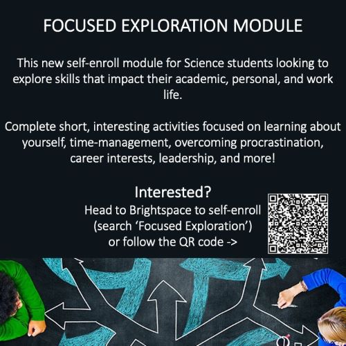 The new Focused Exploration Module is all about exploring different ideas and skills that impact your academic, personal, and work life. This self-enrol, self-paced Brightspace module is intended to help Science students learn more about themselves, their time-management, overcoming procrastination, career interests, advising opportunities, and developing their inner leader. To sign-up, click here or head to Brightspace -> Academic Support (tab at top) -> Self Registration, and search for the course ‘Focused Exploration’ (code: ONLC.FOCUSEX). The module runs during a single semester. During the fall 2022 term, it will open on September 6 and close November 30th (final activity submissions due Nov. 20th). To ‘complete’ the module, students must complete 6/10 strategies. Each strategy focuses on a different topic and typically involves watching a short video (e.g., TED Talk) or listening to a short podcast. Students then complete short, interesting activities intended to help them learn more about themselves and their academic, work, and life pathways. Upon completion, students will receive a certificate of completion and can opt to have this added to their Co-Curricular Record (CCR). For more information, check out the Brightspace page (search ‘Focused Exploration’).