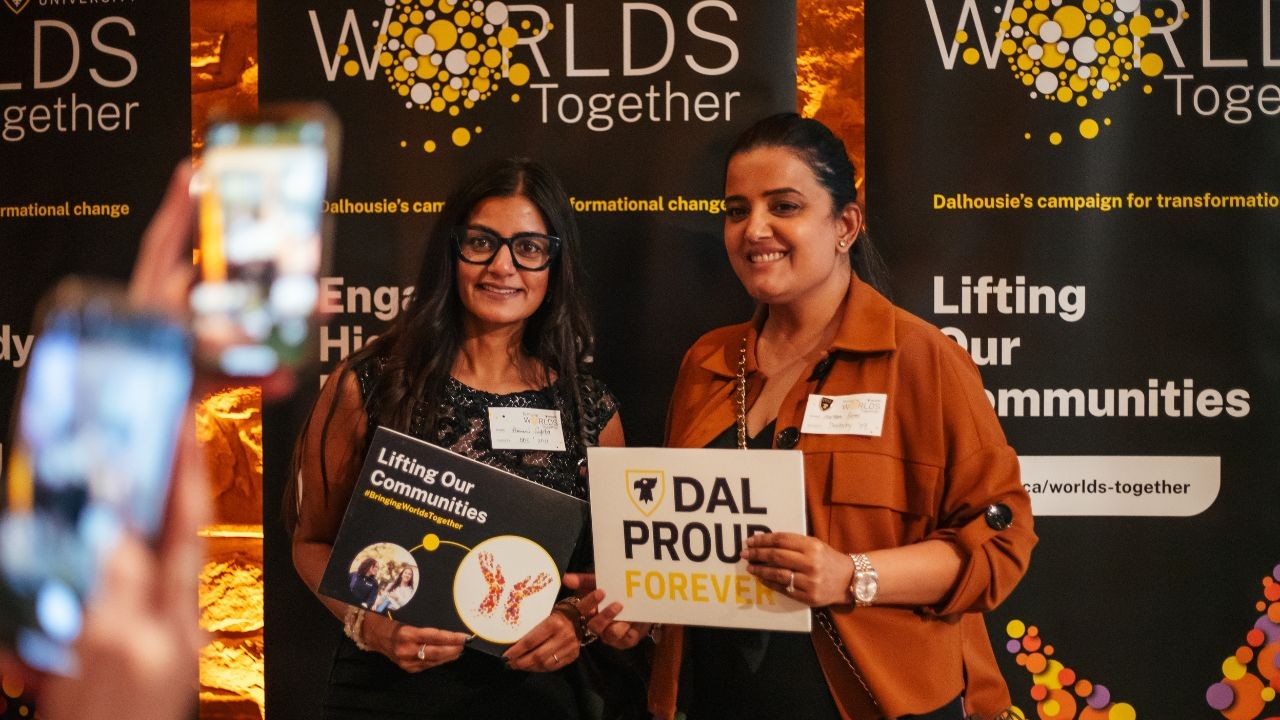 Two female-presenting people stand together in front of Dalhousie-branded banners holding a "Dal proud forever" sign and smiling.