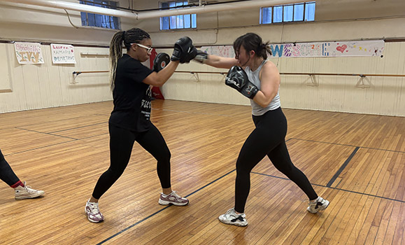 The session opened with a poem about trauma and reconnecting with the body before the session moved into some basic boxing techniques. Participants learned footwork, hand positioning, and how to punch with proper form, eventually working with gloves and pads to release tension from the body.