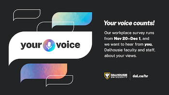 The Your Voice survey is a workplace survey designed for faculty and staff to share their thoughts and ideas on the strengths of Dalhousie and where it could improve in terms of the employment experience.
